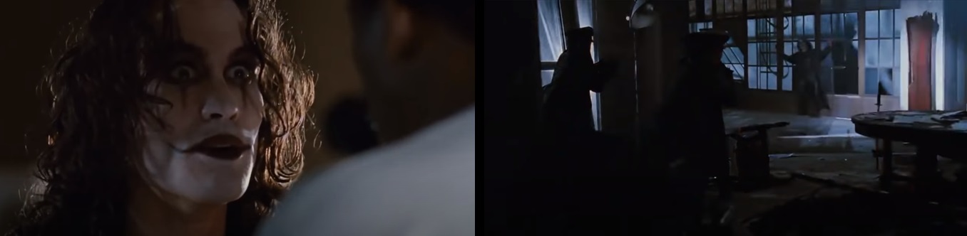 Entonces, llegan los flashbacks a la mente de Eric. El dolor emocional al recordar el horror vivido hace un año lo atormenta. Encuentra entonces una máscara de arlequín, de uno triste y lastimero que se conservaba allí en la azotea desde tiempos de Shelly. Una suerte de valor se va pintando en su rostro al mismo tiempo que coge maquillaje blanco, se pinta el rostro cual arlequín tenebroso, como evocando aquella máscara, toma prendas del lugar y ya con firmeza en su caminar y el cuervo en su hombro, se percibe cómo su personaje se ve claramente infundido de un nuevo e inusitado valor, era la sed de venganza, de hacer justicia por mano propia.